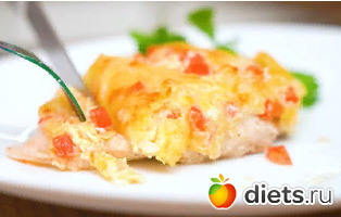 6. Форму смазать растительным маслом, выложить куриное филе. Сверху выложить «шубку». Посыпать сыром.
