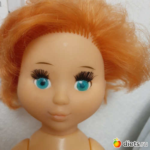 Глазки. Утерян грузик, который позволяет глазкам моргать. Пришлось наращивать утяжелитель горячим клеем. Нужно подкорректировать. Немного не симметрично закрываются. Сломана ось, которая держит глазик горизонтально - нарастила сломанной иглой. Ну и вставила новые реснички