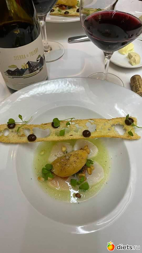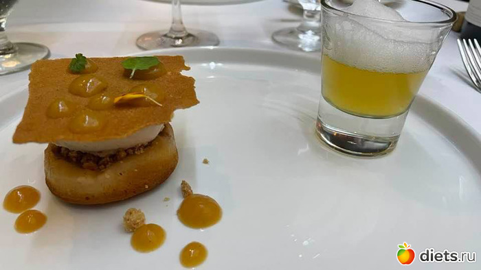 Молекулярная кухня, как я понимаю, когда делают необычные вещи из обычных продуктов. Например, на фото щербет из помидора. И на гренке, которая мм толщиной капельки чесночного соуса. А на десерт был торт персиковый с прослойкой из мороженного, а в стаканчике холодный чай