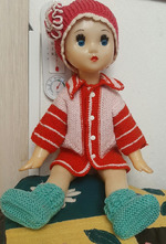 Ну и, чтобы внук не боялся голую с пятном на животе и без головы куколку Наташу, принарядила её в подходящий для ее размера жакетик и пинетки, которые вязала для новорожденного..