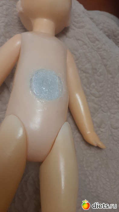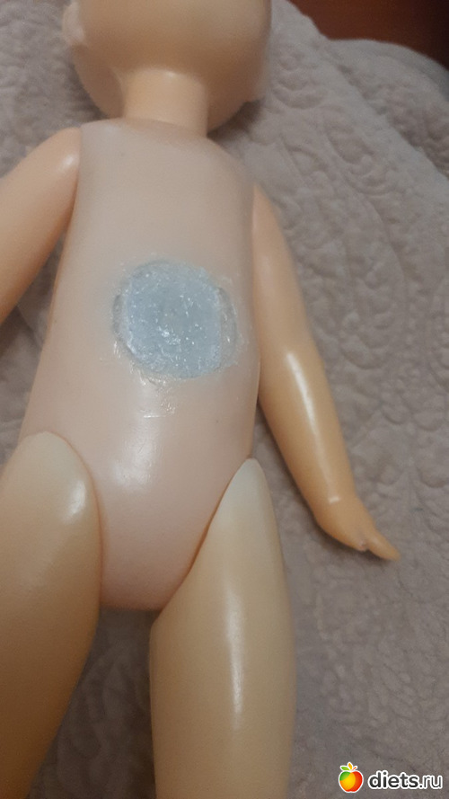 Заделала дырку на животе при помощи очень плотного картонного от настольного календаря и горячего клея