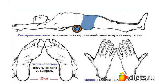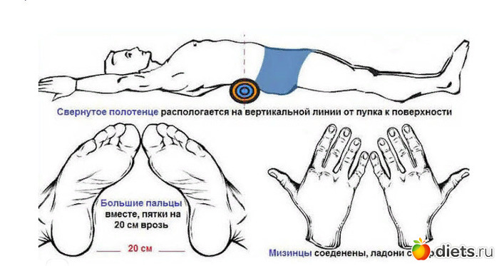 Техника выполнения: Вам понадобится полотенце или валик, для начала, диаметром с кулак. А лучше подобрать диаметр по ощущениям — не должно быть сильного дискомфорта. Диаметр валика постепенно увеличивайте. Лягте на спину и подложите валик под поясницу, на уровне пупка. Ноги вытяните вниз, а вот со ступнями нужно проделать следующую фишку: пятки разведите на 15-20 сантиметров, а мыски сведите до касания. Руки вытяните вверх, а кисти расположите так, чтобы ладони лежали на полу и мизинцы обоих рук соприкасались. Сразу скажу положение жуть какое неудобное. Но в этом и вся соль. По заявлению автора неудобное оно лишь потому, что осанка большинства людей потеряла тот первозданный вид, который бы позволил выполнять это упражнение без дискомфорта. В такой неудобной позе нужно пробыть не менее 3 минут.