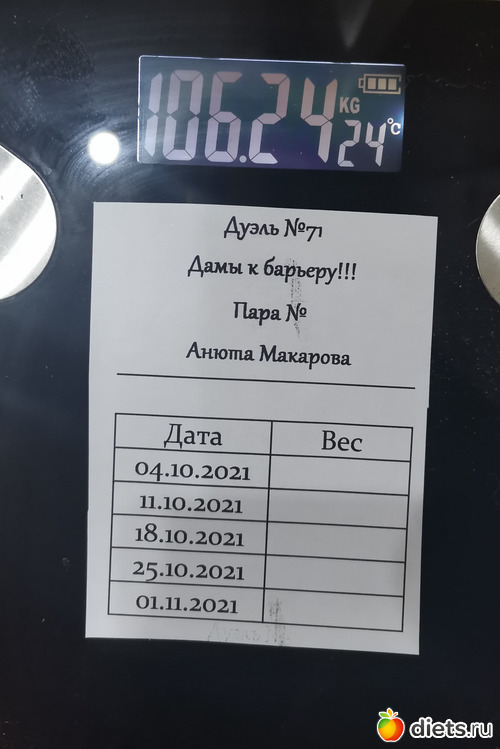 Доброе утро. Сбросила немного веса с начала регистрации. Была 109.9 а стала 107.4 отвес 2.5. Общий отвес за первую неделю что я худею 3700. Там похудение пойдет далее плавнее. Уходит водичка. Прошла первая неделя на диете Магги творожный вариант .