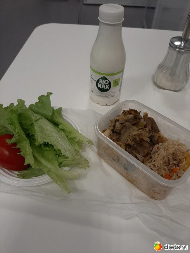 Обед: салат, помидор, рис от плова и тушёная капуста с грибами. До Биомакса не знаю, дойдёт очередь или нет.