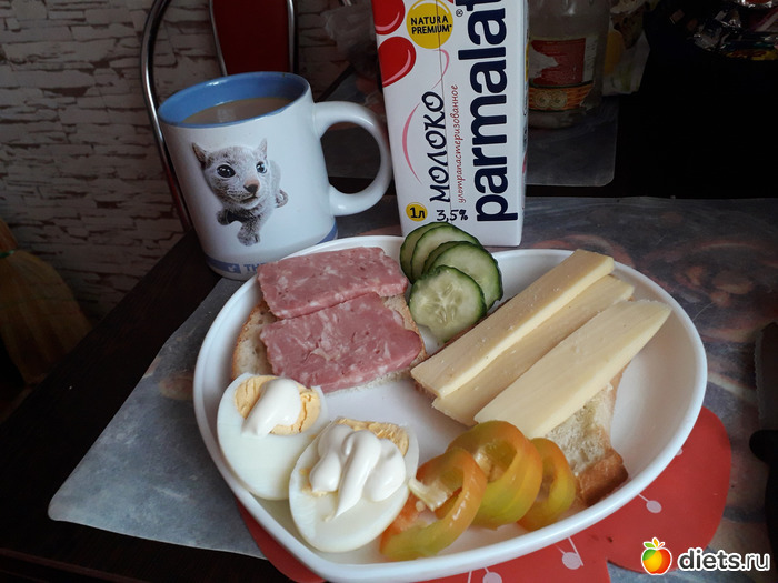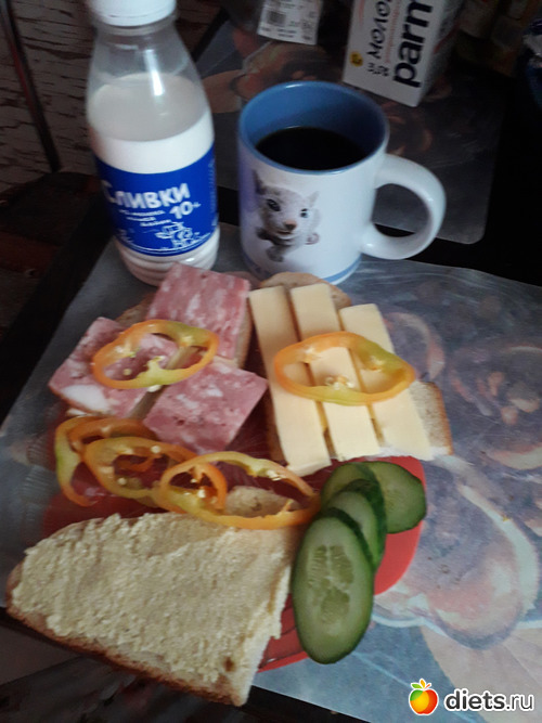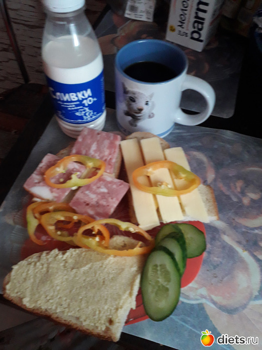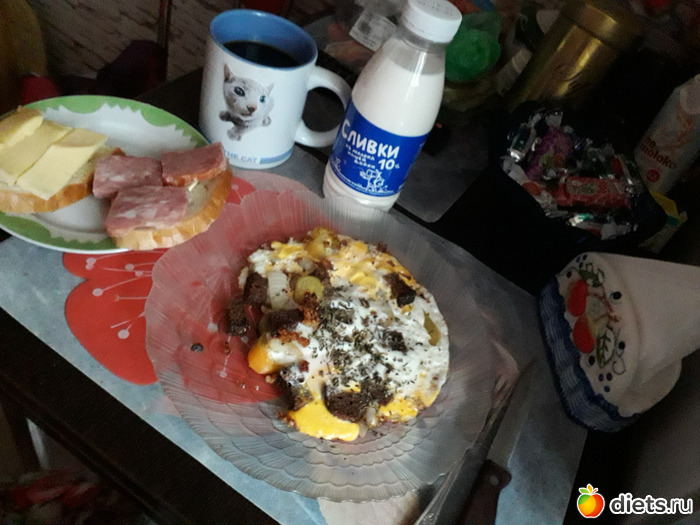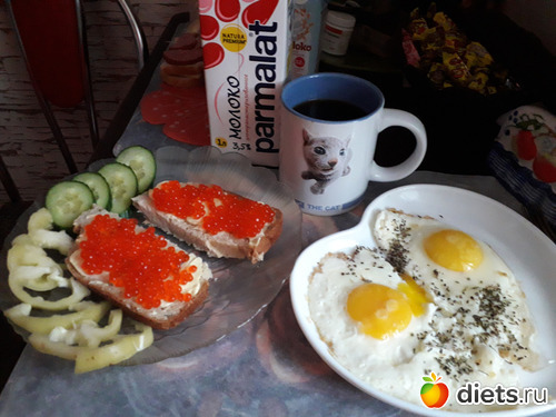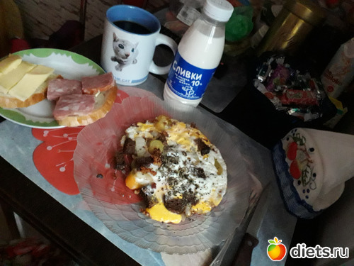 -Яичница с сухим базиликом, бутерброды, кофемолоко