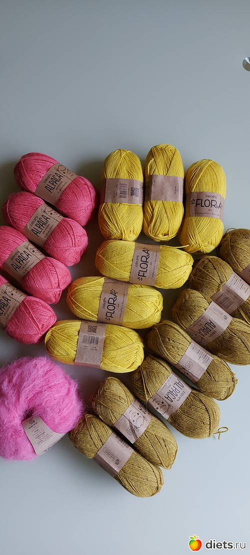 Одна из посылок - пополнение пряжных запасов. Была скидка на всю альпаковую пряжу, дочка выбрала розовенькие моточки, я себе - желтые