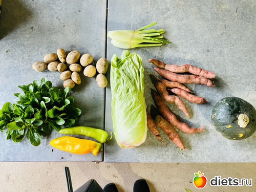 Сейчас такой набор: морковка, лук, чеснок, свекла, порей, тыква, цуккини, баклажаны, цв капуста, болгарский перец, обычная капуста, квашеная капуста, айсберг, авокадо. Это более-менее дешево сейчас у нас, в пределах 1,5 евро/кг (авокадо по 0,59 штука)