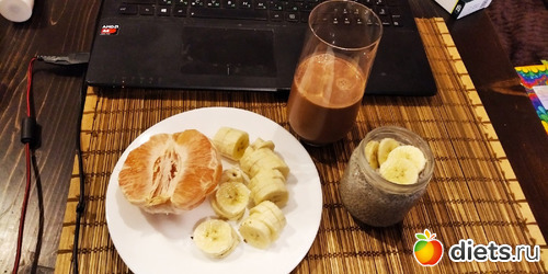 Скину завтрак и перекус)) На завтрак банан и половинка грейпфрута, на перекус/обед получилось 200 мл овсеного шоколадного молока и пудинг из чиа с бананом.
