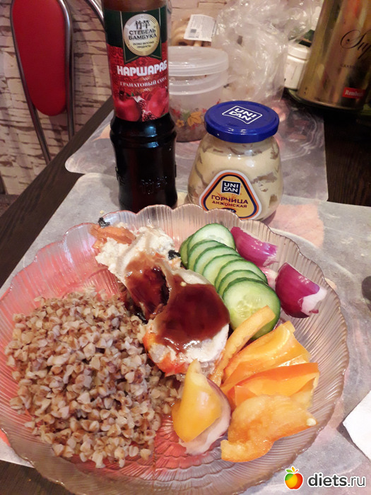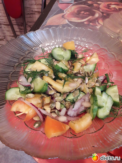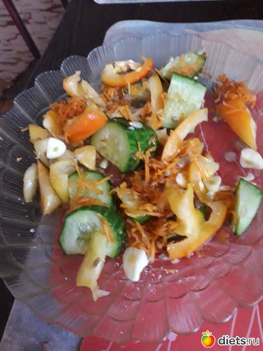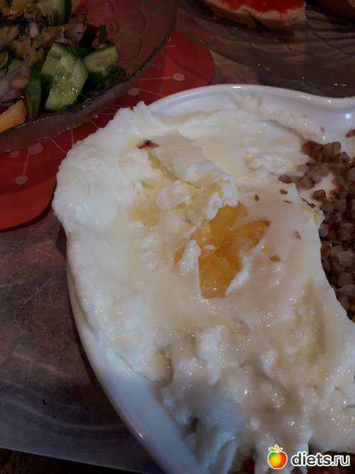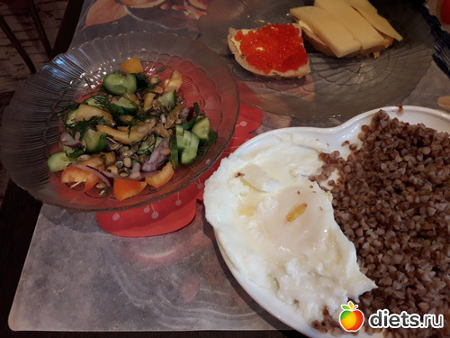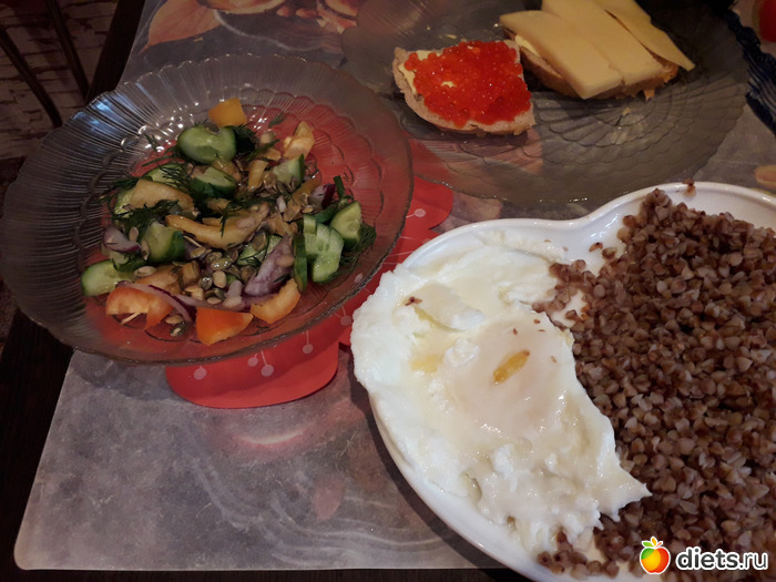 В обед не было возможности нормально приготовить, занята была. В итоге, по-быстрому, приготовила-салат овощной с ароматным маслом и с тыквенными семечками, гречка и яичница, пожаренная на ВОДЕ, БЕЗ МАСЛА(много в интернете способов пожарить яичницу на воде)