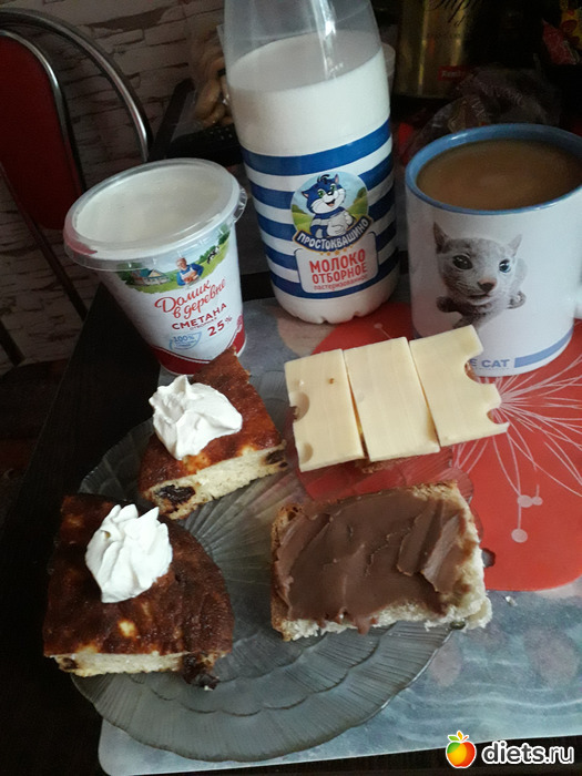 -Запеканка творожная со сметаной-надо есть, а то испекла и стоит. Бутерброды-с шоколадным маслом и с сыром. Кофемолоко