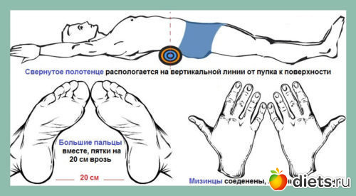 Всё относительно просто: нужно положить валик под поясницу ровно под пупком (или под лопатки), пятки сделать на 15-20 см врозь и соединить большие пальцы, как будто косолапить. Руки поднять над головой, перевернуть ладони к полу. Стараться в этой позе расслабиться.