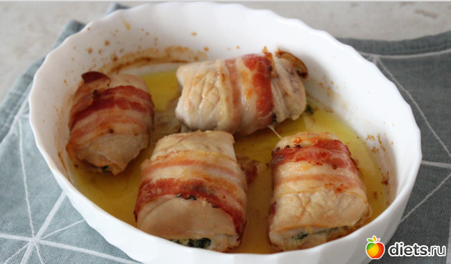 Мясо с маслом сворачиваю в рулет и оборачиваю полоской бекона. Выкладываю получившиеся рулеты в форму для выпечки и отправляю в разогретую до 180 градусов духовку на 35 минут.