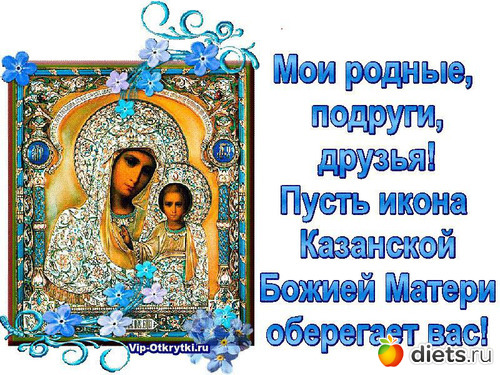 Поздравляю с днем Казанской иконы Божией Матери. Пусть она хранит вас от бед, болезней, приносит счастье, здоровье, благополучие вам и вашим близким.