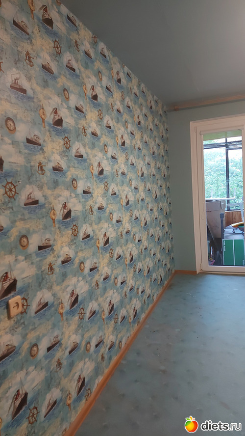 Вот так выглядели обои, одна стена в кораблик, 2 голубые, одня желтая.