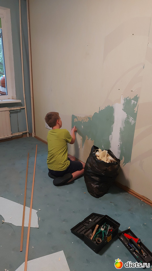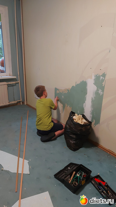 В предыдущий раз ремонт в детской делали, когда сыну было 4, а сейчас ему 13. Т. е. 9 лет продержался тот ремонт, конечно, каждый год комната по-немножку изменялась. В тот раз утеплили стену, поменяли окно и дверь на балкон, на стены и потолок клеили обои, а на пол положили ковер. Под ковром - пошарпанный паркет, пошарпанный, потому что до детской там был ну скажем так мой кабинет