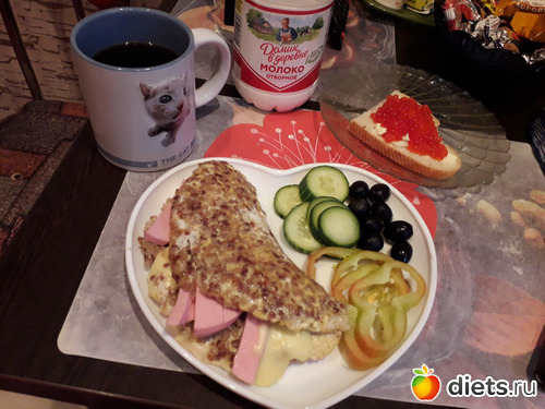 -Яйца с соусом, крабовые палочки, кофемолоко