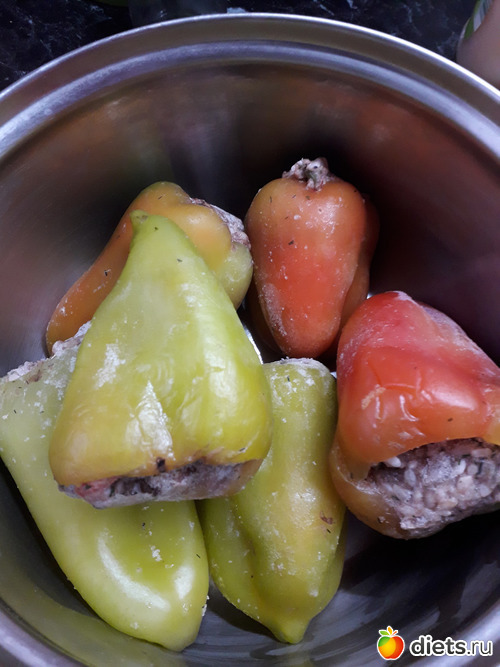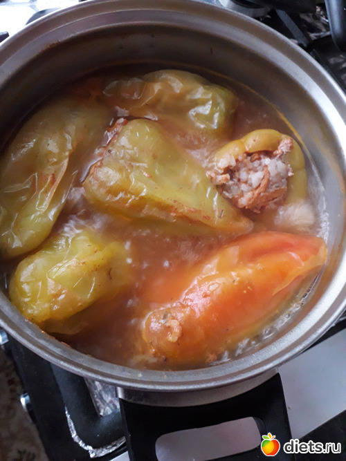 Когда тушу много перцев-ставлю их "Стоя". Сегодня всего 6 штук-просто"Лежа "и чтобы были в соусе (Фотографировала-в процессе варки)