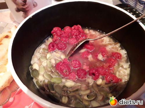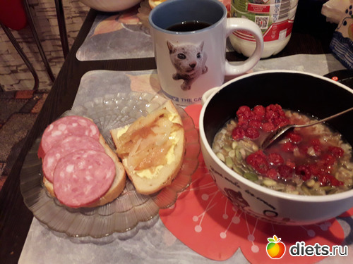 -Творог со сметаной и с малиной(у мужа). Овсянаякаша на воде с медом, тыквенными семечками и малиной(у меня) Бутерброды, кофемолоко