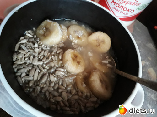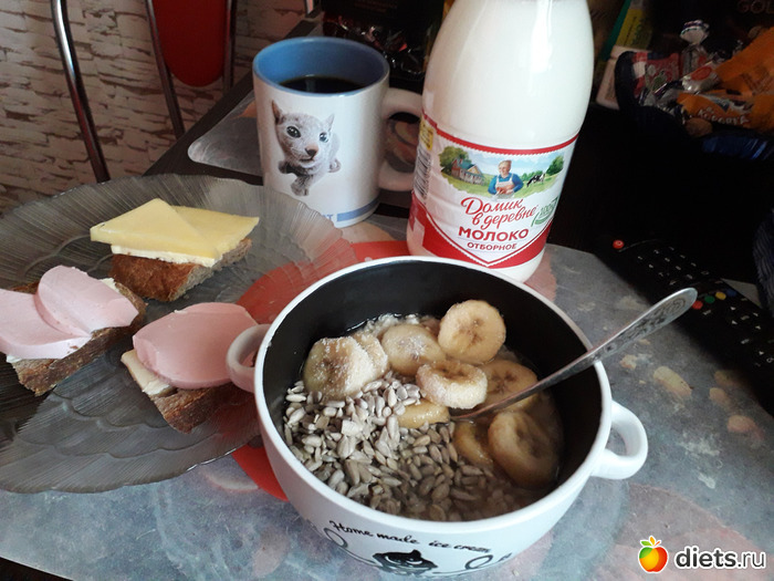 -Геркулесовая каша на воде с семечками, медом, бананом. Бутерброды. Кофемолоко