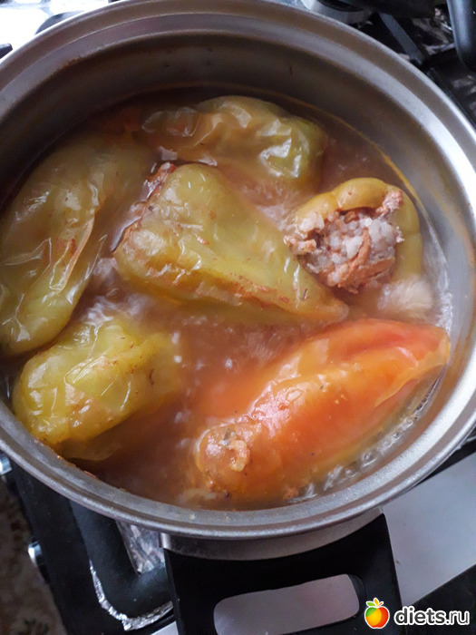 Когда тушу много перцев-ставлю их "Стоя". Сегодня всего 6 штук-просто"Лежа "и чтобы были в соусе (Фотографировала-в процессе варки)