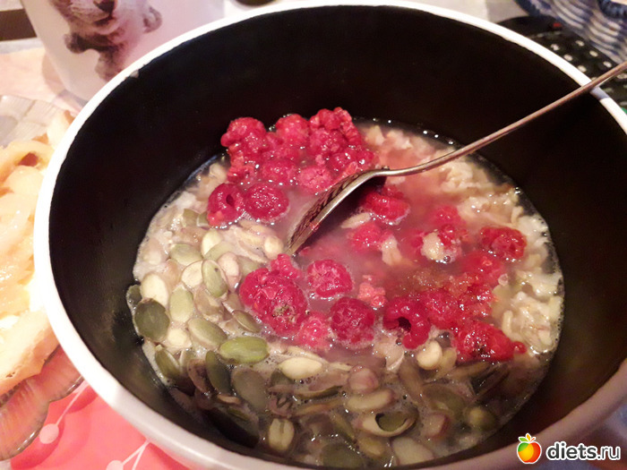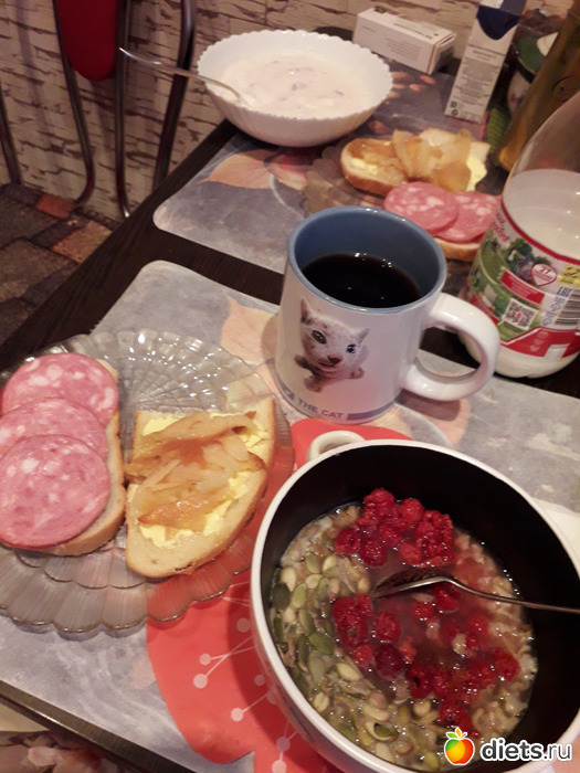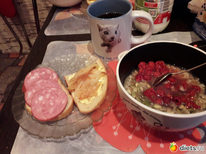 -Творог со сметаной и с малиной(у мужа). Овсянаякаша на воде с медом, тыквенными семечками и малиной(у меня) Бутерброды, кофемолоко
