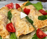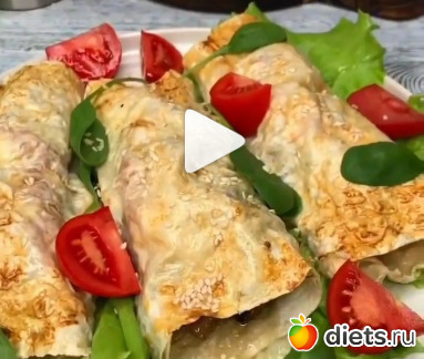 3. Лаваш нарезаем на куски примерно 12 на 18 сантиметров. Выкладываем на лаваш курицу, грибы, шпинат, нарезанные помидоры и брынзу. Заворачиваем в рулет и выкладываем в форму. Ее лучше предварительно смазать маслом и кладите рулеты так, чтобы между ними оставалось расстояние, иначе слипнутся.