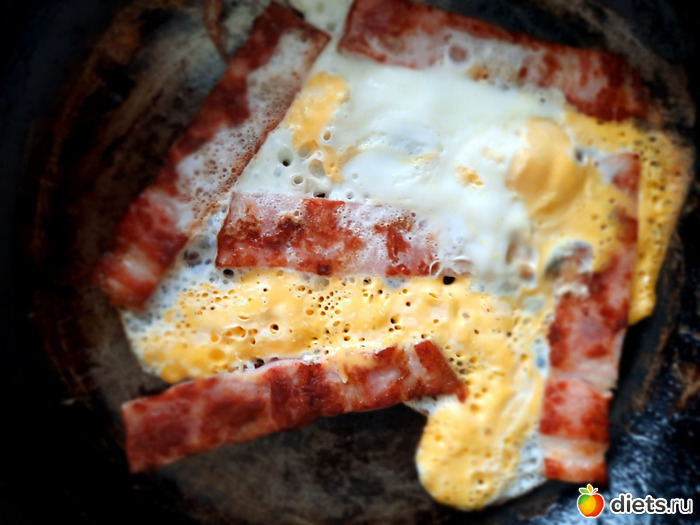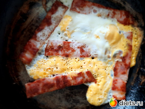 мой второй завтрак (яишенка 1 яйцо с беконом на старой сковородке без масла, жир в беконе же есть, хотя он мясистый больше, жира там кот Тимон наплакал)