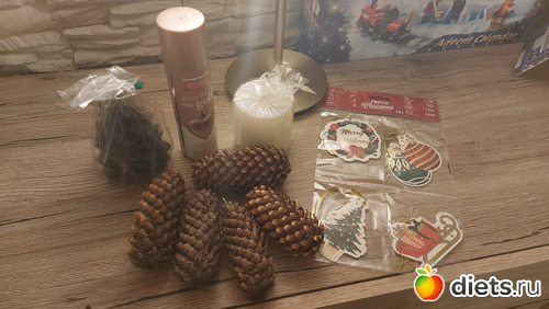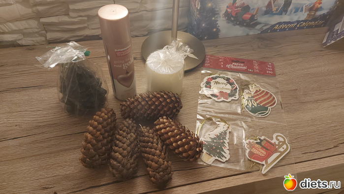 Немножко декора - этикетки на подарки, свечка, спрей с блестками (выбор цветов поразил, каких только не было, взяла розовое золото) шишки насобирала в парке, будем красить