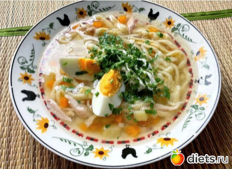 Провариваем до всплывания лапши, примерно пару минут, и выключаем. Подаем суп с половинкой варёного яйца и свежей зеленью.