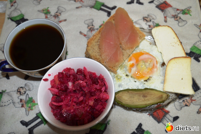 Завтрак, он же обед: глазунья, сыр, балык, авокадо, хлеб, винегрет