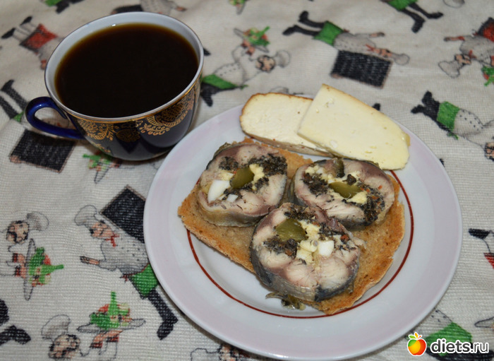 Обед: кофе, хлеб, сыр домашний, рулет из скумбрии с яйцом, грибной икрой, маринованными огурцами.
