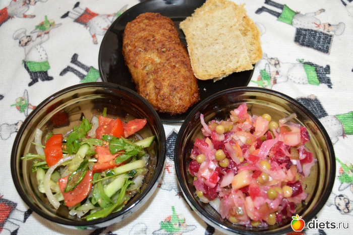 Ужин: куриная котлета, запечённая без жиров, хлеб, винегрет, салат с помидорами, огурцом, луком, рукколой и подсолнечным маслом