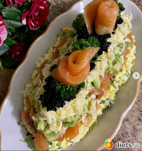 Сверху выложить красную рыбу, нарезанную кубиками... Читать полностью