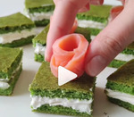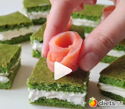 А потом начинаем создавать красоту! Обильно смазываем получившийся корж любым творожным сыром, разрезаем пополам. Накрываем одну половину другой и нарезаем на "пироженки". Сверху украшаем красной рыбой