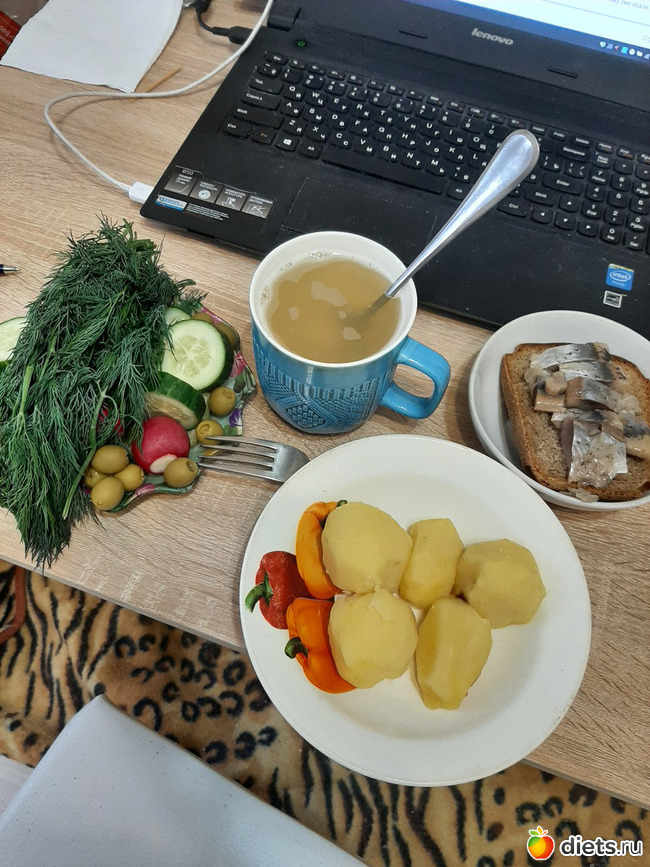 бульон рыбный с добавлением пшена (сварила все 5 пакетиков, 4 заморозила), огурчик, укроп, перчик, редиска. Картошка варёная, хлеб с селёдкой по-исландски.