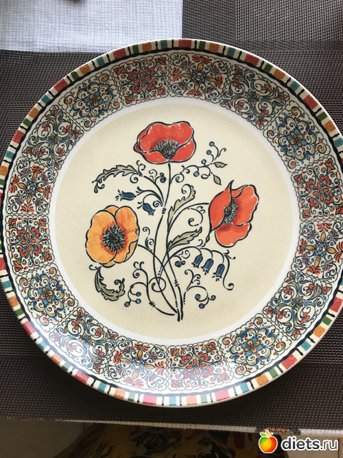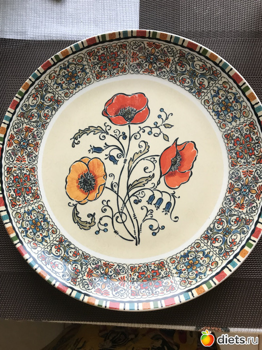 Вот такая итальянская керамическая тарелка с маками. Написано было, что обеденная, но она очень большая. скорее всего она бод небольшой пирог, пиццу, бутерброды. Купила две штуки.