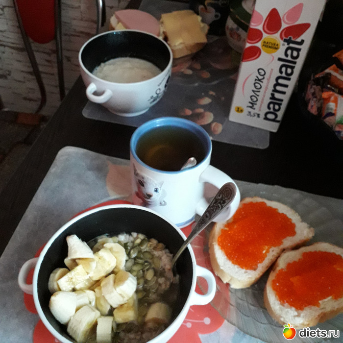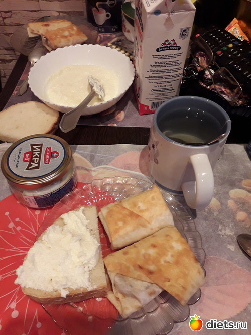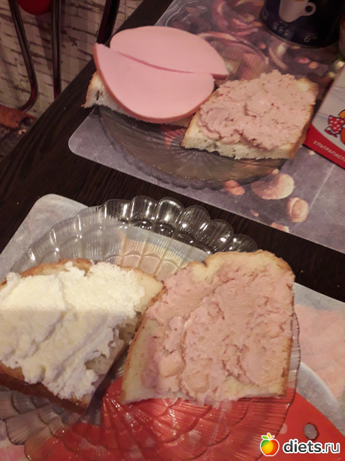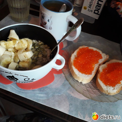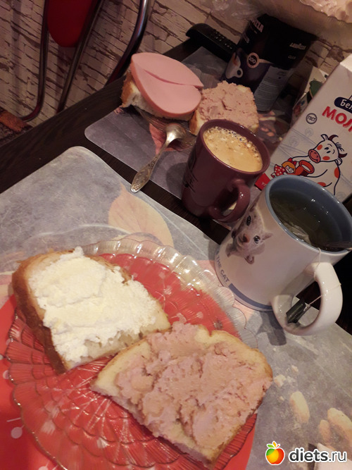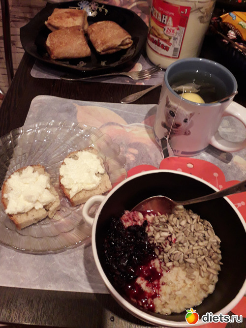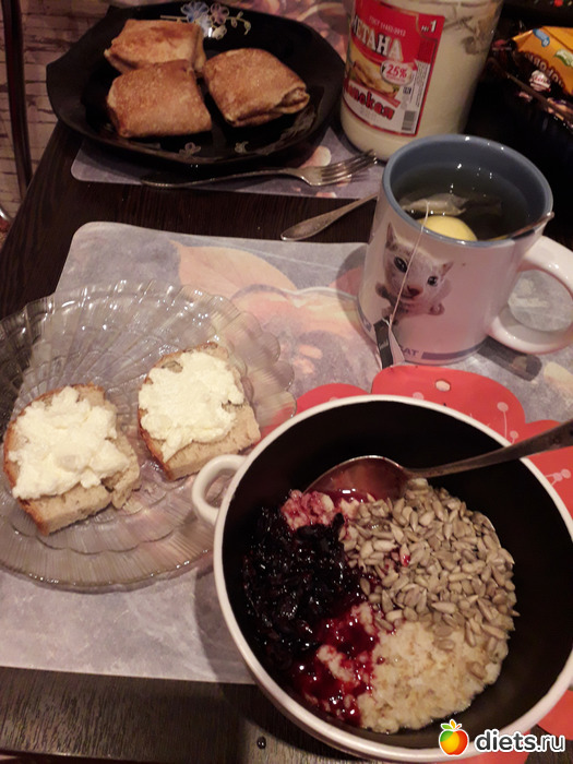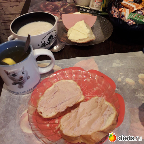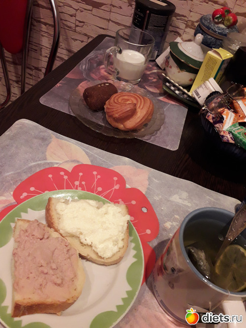 -Бутерброды с печенью трески, чай с лимоном. У мужа-пшенная молочная каша и бутерброды