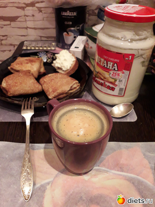 -Блинчики(у мужа) с творогом, бутерброд, кофе с молоком