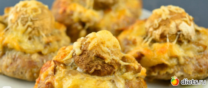 Сформировать лепешки из мясного фарша и сделать по центру каждой из них углубление. В него нужно будет положить грибную начинку.