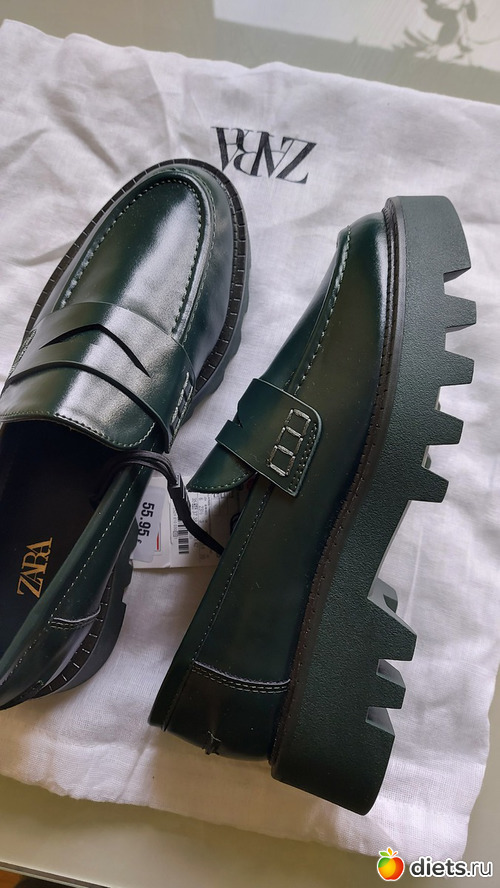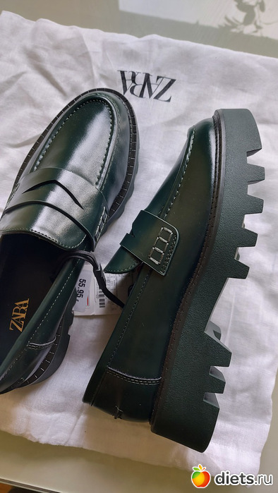 Зары - лоферы на грубой подошве. Мне понравился темно-зеленый цвет. Подошва тоже темно-зеленая