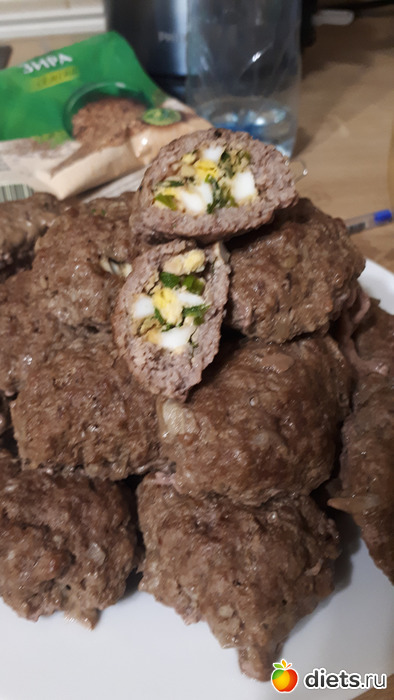 Потом сделала для разнообразия котлетки с сюрпризом (обычный говяжий фарш с луком, хмели-сунели и водой, а внутрь положила яйцо с зеленым луком). Получилось симпатично.