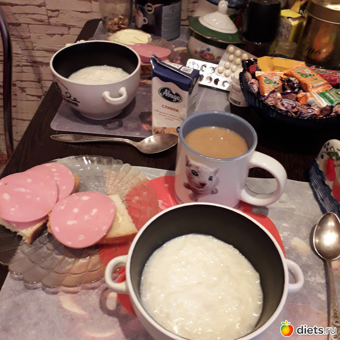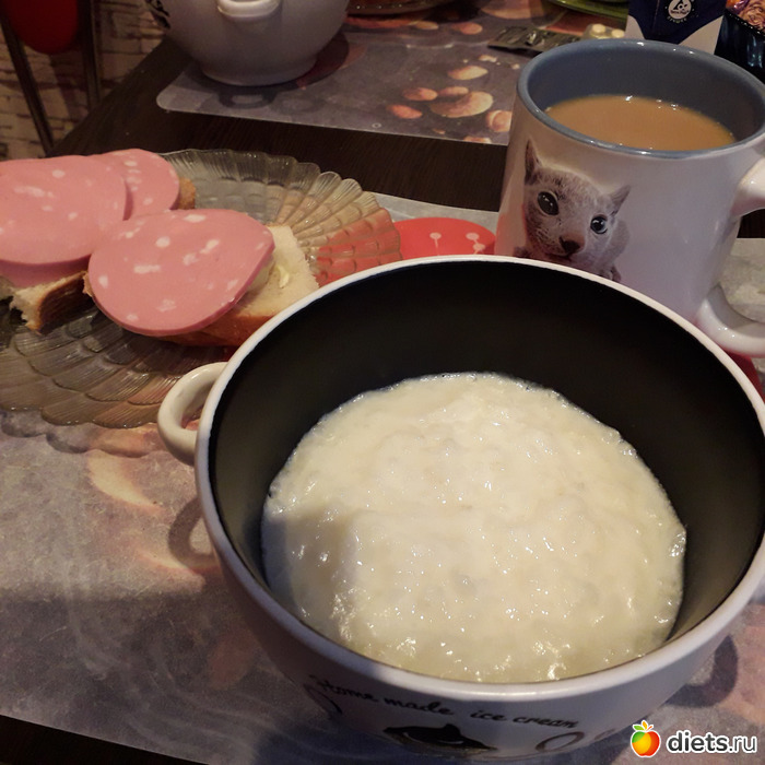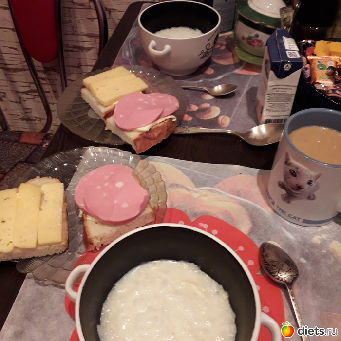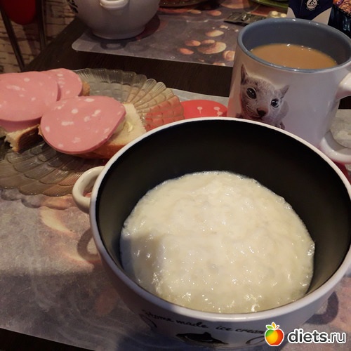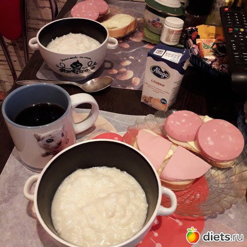 -Каша рисовая(-доели ее), бутерброды, кофе со сливками