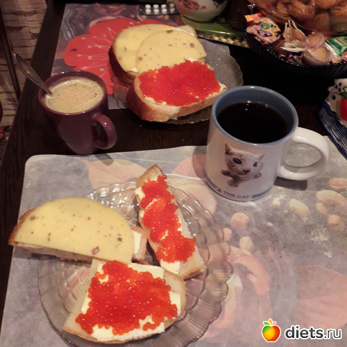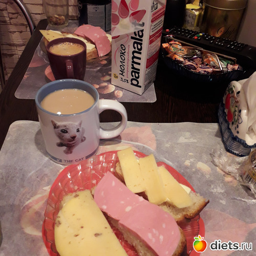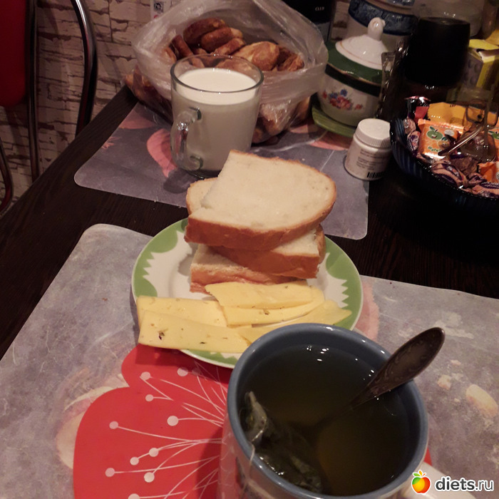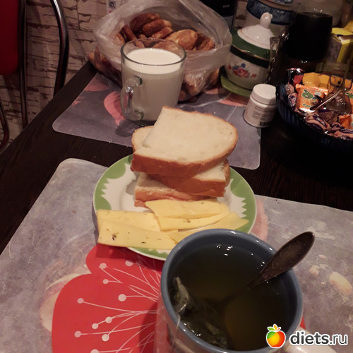 -Сыр и чай(у мужа молоко и слоеное печенье"Ушки", теплый хлеб из пекарни)