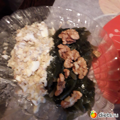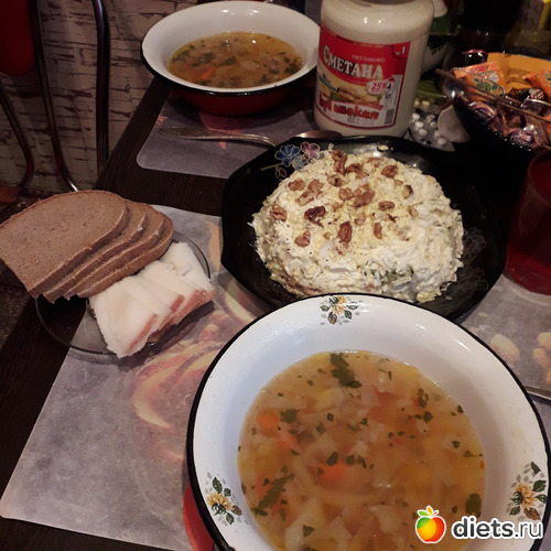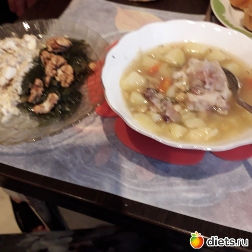-Суп, салат рыбный- с сайрой., морская капуста с орехами, компот