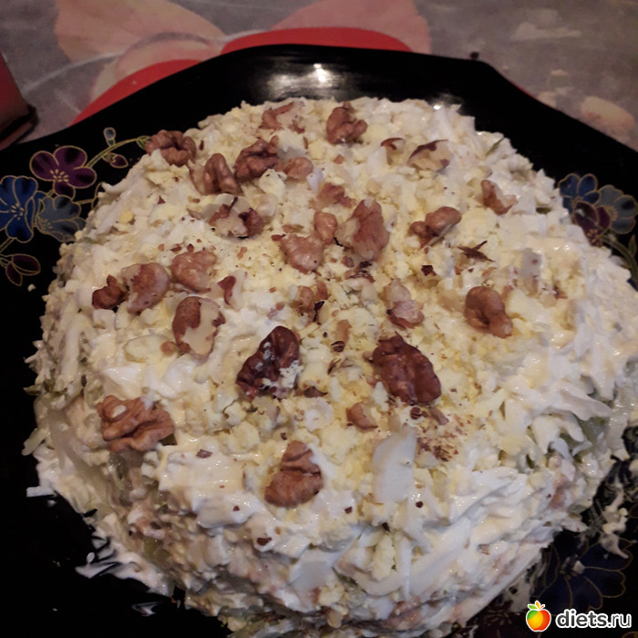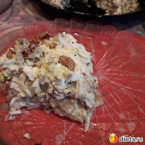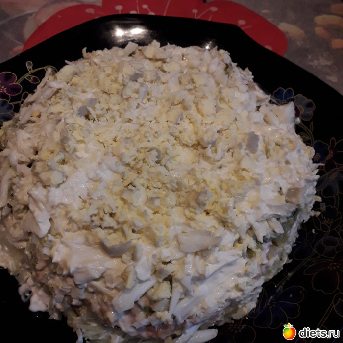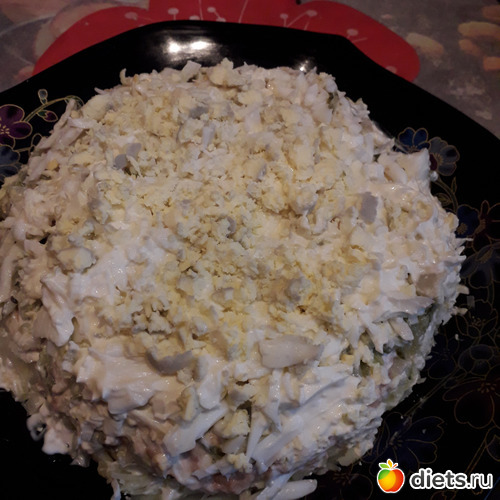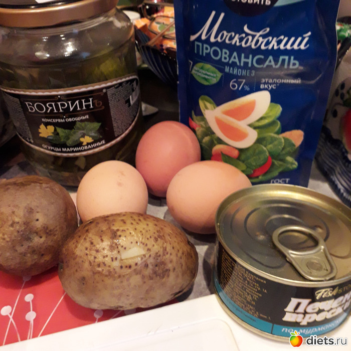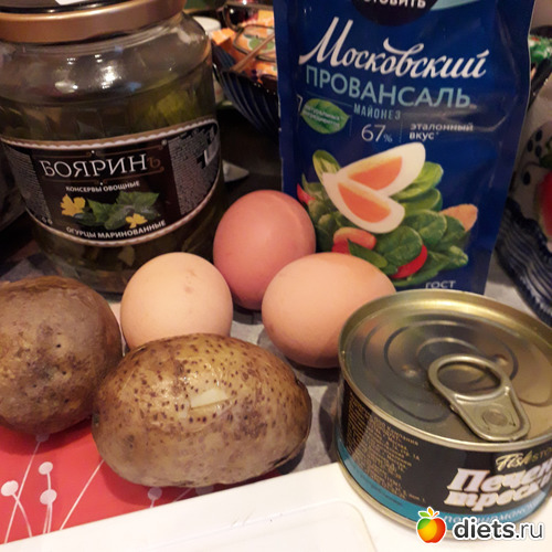 Слои:-отварной картофель(2шт)-лук репчатый(1шт)-печень трески(1баночка -весом125г)-отваренная морковь(1шт)-консервированные огурцы(2шт)-белок яйца(3шт)-желток яйца(3шт)-сыр твердый(50г)