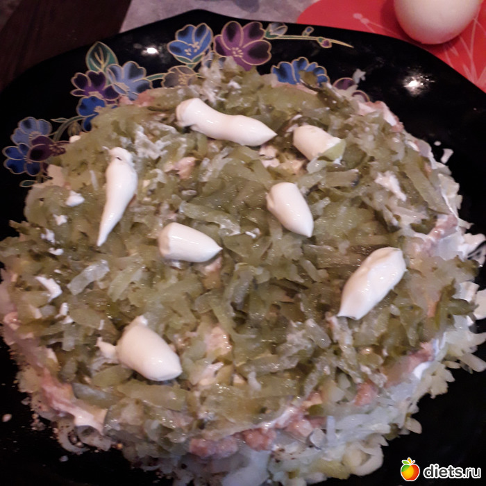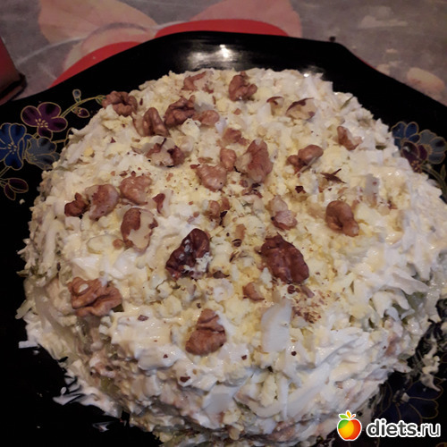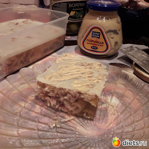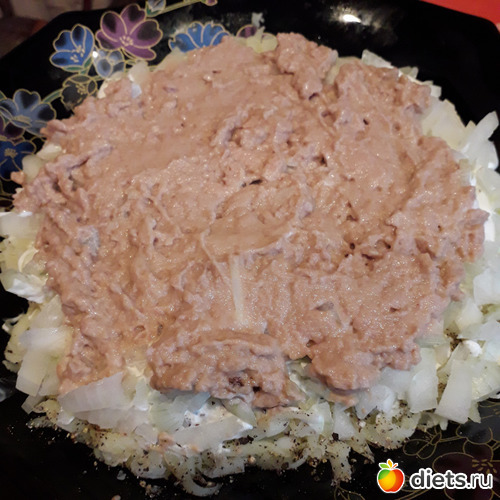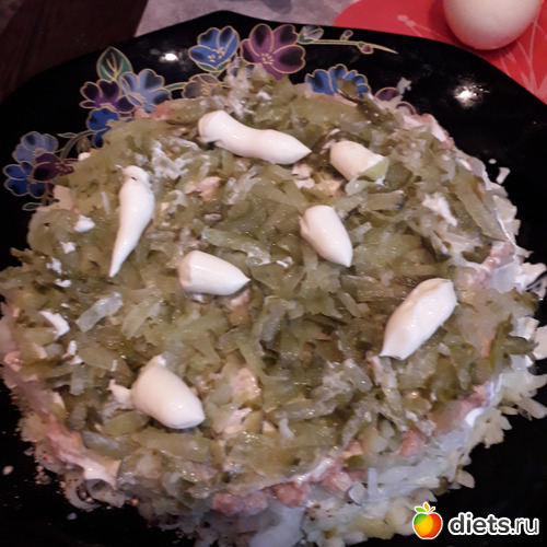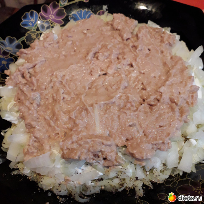 Делается слоями. Слои -по потребности промазываются майонезом. Конечно, лучше использовать домашний майонез-но мне было лень его делать! Все натирается на терке. Печень можно использовать-по-мурмански или по-скандинавски, которая уже паштетом. Лук лучше использовать маринованный или ошпаренный кипятком.