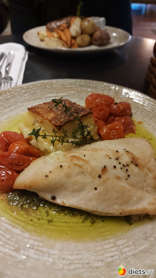 На второе я - курогрудь с рикоттой и картофельным гратином, он - стейк из говядины