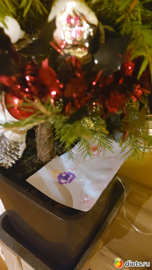 Под елочкой лежит бумажка - это письмо от дочки Деду Морозу, но не то, где заказы на подарки - то давно "выслано"