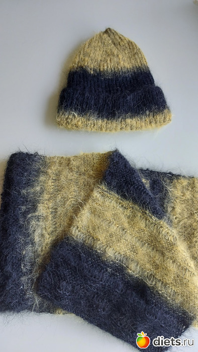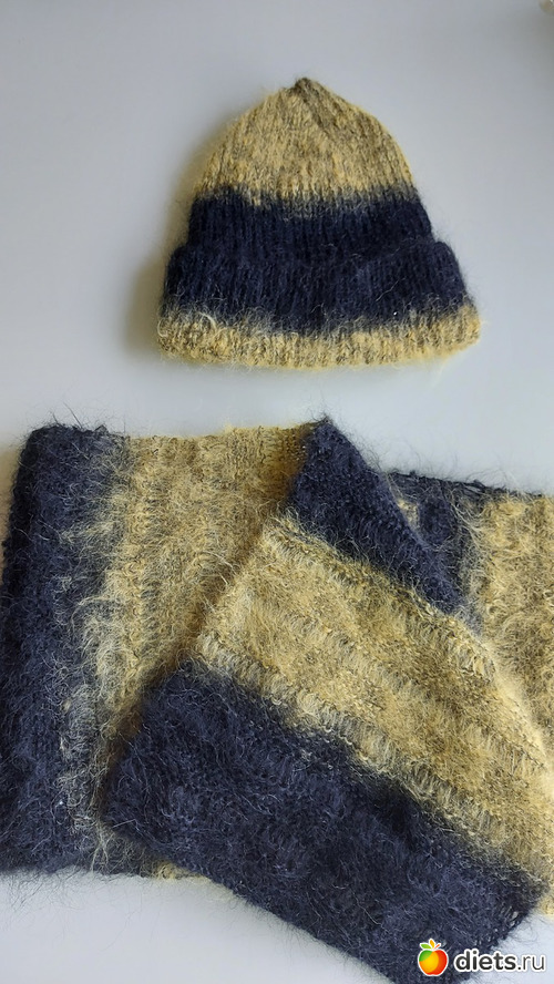 4. 5. Шапка и шарф. 60 % шерсть, 40 % хлопок. Очень удивила пряжа - по виду как длинноволосый мохер, а на деле шерсть с хлопком. Вязала не комплектом, в смысле не что бы носить их вместе. Просто пряжа оказалась очень экономной, неожиданно хватило на 2 вещи