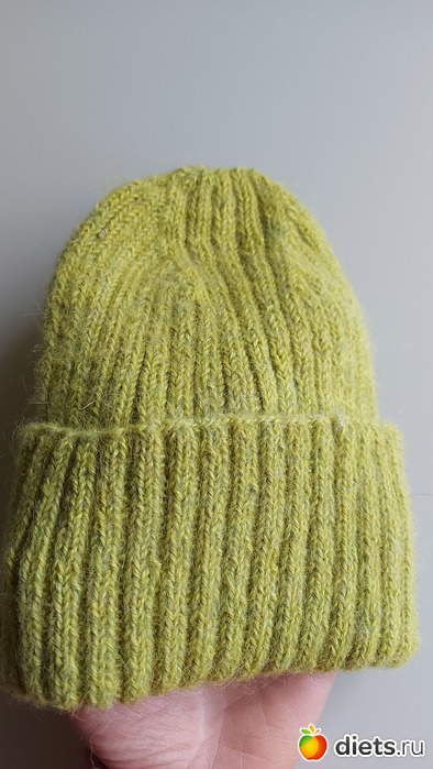 Следующие две работы - простые шапки бини. Эта - из двух нитей и резинкой 2*2, а следущая - из одной нити и резинкой 1*1. Макушки тоже закрыты малость по-разному, а так шапки одинаковые. Альпака 100 % + ангора 80 % полиамид 20 %